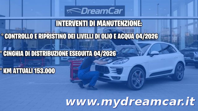 I KM CORRETTI SONO 153000. Se desideri vedere TUTTE le foto di quest?auto visita www.mydreamcar.it Per evitarti inutili attese e per aver conferma della disponibilità dell?auto ti invitiamo a FISSARE SEMPRE un appuntamento in salone. Per ottenere velocemente informazioni aggiuntive al di fuori degli orari di apertura puoi SCRIVERE tramite WHATSAPP ai seguenti numeri 3487467270 Marco. Se ci invii una mail info@mydreamcar.it ricordati di indicare sempre anche un numero di telefono e QUANDO potrai rispondere. Possibilità di finanziare il prodotto fino a 84 mesi con zero anticipo Possibilità di inserire nel finanziamento una copertura furto/incendio/atti vandalici/intemperie/cristalli tutto a zero franchigia e fino a tre anni valore a nuovo. Per info linea diretta 0421630241. Condizioni chiare e trasparenti. Permutiamo il tuo usato. Consegna a domicilio in tutta Italia, isole comprese, previo accordo economico Prezzo passaggio di proprietà escluso -L'AUTO VIENE CONSEGNATA TAGLIANDATA , KM ORIGINALI, (Vedi eventuali foto libretto tagliandi). -N.B. IL CHILOMETRAGGIO DI TUTTE LE NOSTRE VETTURE VIENE DICHIARATO E RIPORTATO SIA SUL CONTRATTO DI VENDITA CHE IN FATTURA! Nota bene: la dotazione tecnica, le fotografie e gli accessori indicati nel presente annuncio potrebbero non coincidere con l?effettivo equipaggiamento della vettura proposta, a causa di differenti modalità di pubblicazione dei diversi portali internet. Vi invitiamo pertanto a contattare il nostro personale specializzato per verificare l?esattezza dei dati riportati. Dream Car Srl declina ogni responsabilità per eventuali involontarie incongruenze, che non rappresentano un impegno contrattuale. Il pagamento dovrà avvenire tramite bonifico bancario anticipato oppure tramite finanziamento. CONSEGNA DELLA VETTURA IN 1 ORA. Passaggio immediato presso agenzia ACI a 2km dalla nostra sede. - Ricevimento clienti direttamente in stazione ferroviaria di San Dona' o all'aeroporto Marco Polo di Tessera VENEZIA o aeroporto Sant'Angelo di Treviso. GARANZIA DI CONFORMITA'12 MESI POSSIBILITA' DI FAR VEDERE L'AUTO DA UN MECCANICO, ANCHE QUELLO DI VOSTRA FIDUCIA presso la nostra sede o in una officina della zona. LE NOSTRE AUTO HANNO TUTTE LA GARANZIA DEL CHILOMETRAGGIO ORIGINALE, GRAZIE AL LIBRETTO DEI SERVIZI O ALLA DICHIARAZIONE NELL'ATTO DI VENDITA. QUINDI CHILOMETRAGGIO DIMOSTRABILE - NO SPIACEVOLI SORPRESE. ORARI LUN 10:30-12:30 ---15:00-19:00 MAR/VEN 9:00-12:30 --15:00-19:00 SAB 9:00-12:30 SIAMO IN: viale Primavera 89/2 incrocio con via Kennedy a San Dona' di Piave cap 30027 VE. Se arrivate dall'autostrada A4 uscita di Noventa di Piave, inboccare via Martiri delle Foibe direzione Jesolo e percorrerla per 8,3km, poi prendere uscita a destra in corrispondenza dell'uscita San Dona', Torre di Fine e tenere la destra all'incrocio, proseguire per un altro chilometro. Ci trovate sulla destra.