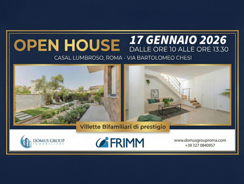 La Domus Group Immobiliare, affiliata Frimm, in collaborazione con Remax Abacus, presenta in esclusiva due eleganti villette bifamiliari di nuova costruzione situate nel cuore del Consorzio Villa Paradiso, in zona Casal Lumbroso. Un contesto residenziale immerso nel verde e nella tranquillità, ideale per chi desidera vivere in un ambiente moderno, riservato e di qualità. Caratteristiche principali Superficie totale:120 mq Distribuzione su quattro livelli studiata per garantire comfort e funzionalità Ampio giardino privato di 300 mq Predisposizione per ascensore interno Posto auto esterno Struttura antisismica di ultima generazione Piano Terra – La zona giorno Un ingresso accogliente introduce alla luminosa zona living open space, con cucina a vista e soggiorno armoniosamente integrati. Il piano è completato da un bagno finestrato con doccia, rifinito con materiali di qualità. Gli infissi in PVC a risparmio energetico, le tapparelle elettriche e le serrande antiscasso garantiscono comfort, sicurezza e isolamento acustico. Dal soggiorno si accede al terrazzo abitabile, con locale tecnico, e all’ampio giardino privato, perfetto per godersi il relax e momenti di convivialità all’aria aperta. Primo Piano – La zona notte Un elegante disimpegno conduce alla camera matrimoniale, impreziosita da una doppia uscita su due balconi privati. Completa il livello un bagno finestrato con doccia, progettato per unire stile e praticità. Secondo Piano – Spazi versatili e moderni Il piano superiore include un locale tecnico articolato in due ambienti, oltre a un vano con predisposizione per bagno e lavanderia. Da qui si accede a un ampio terrazzo panoramico, collegato al lastrico solare, predisposto per l’installazione di pannelli solari con boiler: una scelta attenta a sostenibilità ed efficienza energetica. Seminterrato – Lo spazio che valorizza l’intera casa Una sala hobby con camino crea un ambiente perfetto come sala relax, area ricreativa, studio o spazio multifunzionale, aggiungendo comfort e potenzialità all’immobile. Una posizione privilegiata Le villette si trovano in un’area residenziale tranquilla e verdeggiante, a breve distanza da scuole, servizi, supermercati e trasporti pubblici. Gli ottimi collegamenti stradali consentono di raggiungere facilmente il centro città, mantenendo però la serenità e la privacy di un contesto esclusivo. ✨ Eleganza, comfort e modernità Queste abitazioni rappresentano la soluzione ideale per chi cerca una casa nuova, funzionale e immersa nel verde, senza rinunciare a stile, qualità costruttiva e tecnologie moderne. Informazioni e appuntamenti Domus Group Immobiliare 06 61561238 327 0840957 (anche WhatsApp) Scopri altre proposte su: [www.domusgrouproma.com](http://www.domusgrouproma.com) [www.frimm.com/sito/44146/](http://www.frimm.com/sito/44146/) --- annuncio pubblicato con GESTIONALEIMMOBILIARE.it